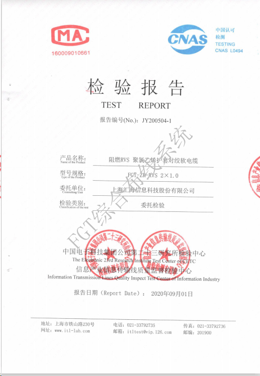 阻燃ZR-RVS2x1.0電線檢測報告